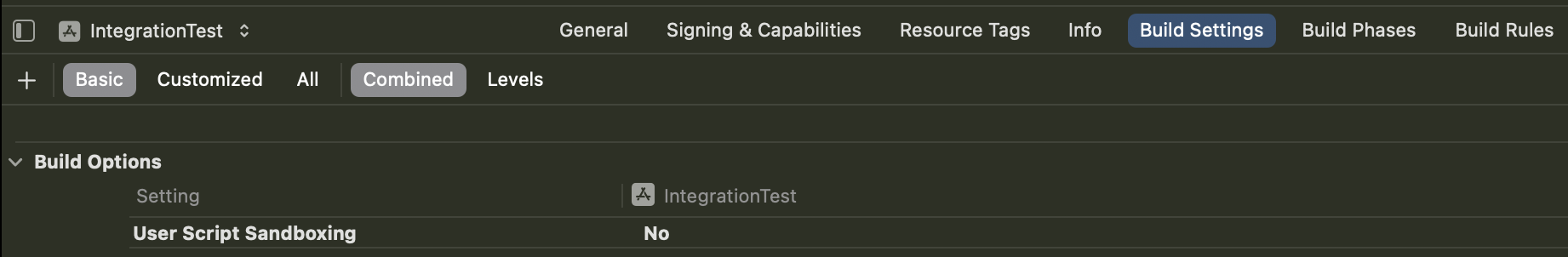 2. Navigate to your Build Settings and disable the User Script Sandboxing option. Disabling User Script Sandboxing ensures that WebView can load and execute scripts necessary for collaborative tools.